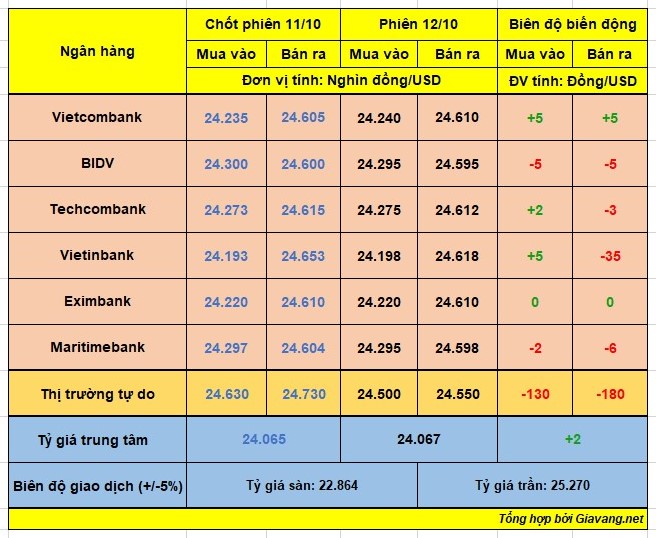 Hôm nay (12/10), Ngân hàng Nhà nước công bố tỷ giá trung tâm cặp đồng tiền VND/USD được áp dụng trong ngày ở mức 24.067 VND/USD, tăng 2 đồng so với công bố phiên hôm qua .