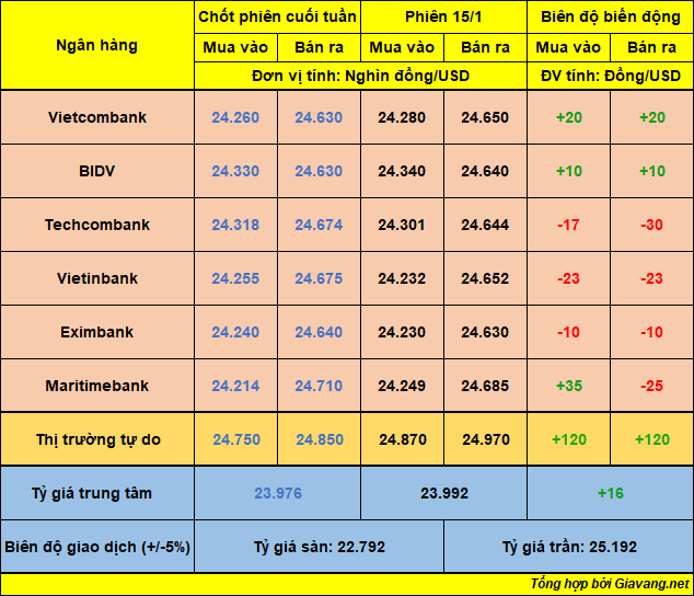 Hôm nay (15/1), Ngân hàng Nhà nước công bố tỷ giá trung tâm cặp đồng tiền VND/USD được áp dụng trong ngày ở mức 23.992 VND/USD, tăng 16 đồng so với niêm yết trước. Với biên độ +/-5% theo quy định, tỷ giá sàn là 22.792 VND/USD, tỷ giá trần là 25.192 VND/USD.