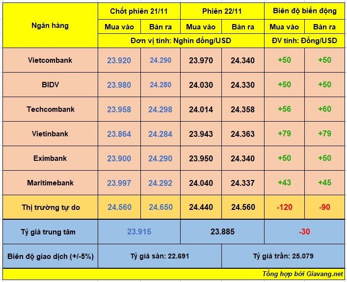 Hôm nay (22/11), Ngân hàng Nhà nước công bố tỷ giá trung tâm cặp đồng tiền VND/USD được áp dụng trong ngày ở mức 23.885 VND/USD, giảm 39 đồng so với công bố phiên hôm qua .