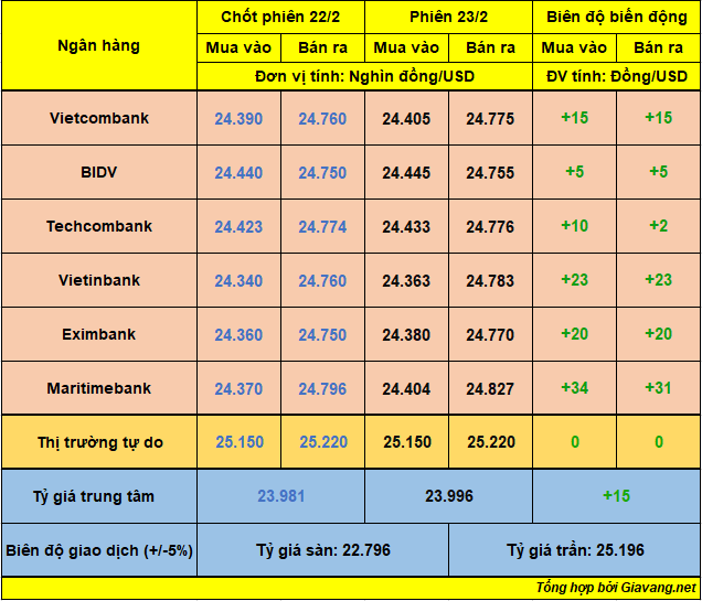 Hôm nay (23/2), Ngân hàng Nhà nước công bố tỷ giá trung tâm cặp đồng tiền VND/USD được áp dụng trong ngày ở mức 23.996 VND/USD, tăng 15 đồng so với niêm yết trước. Với biên độ +/-5% theo quy định, tỷ giá sàn là 22.796 VND/USD, tỷ giá trần là 25.196 VND/USD.