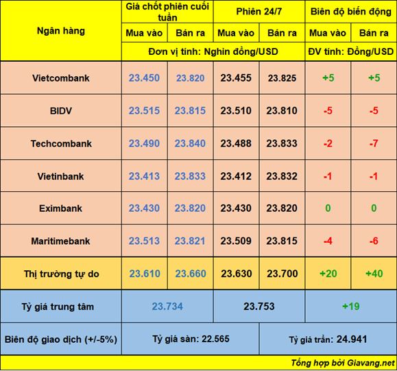 Hôm nay (24/7), Ngân hàng Nhà nước công bố tỷ giá trung tâm cặp đồng tiền VND/USD được áp dụng trong ngày ở mức 23.753 VND/USD, tăng 19 đồng so với công bố trước. Với biên độ +/-5% theo quy định, tỷ giá sàn là 22.565 VND/USD, tỷ giá trần là 24.941 VND/USD.