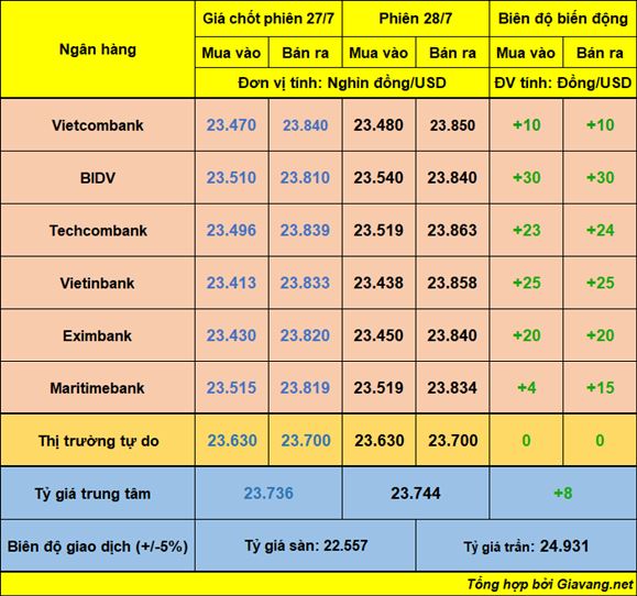 Hôm nay (28/7), Ngân hàng Nhà nước công bố tỷ giá trung tâm cặp đồng tiền VND/USD được áp dụng trong ngày ở mức 23.744 VND/USD, tăng 8 đồng so với công bố trước. Với biên độ +/-5% theo quy định, tỷ giá sàn là 22.557 VND/USD, tỷ giá trần là 24.931 VND/USD.