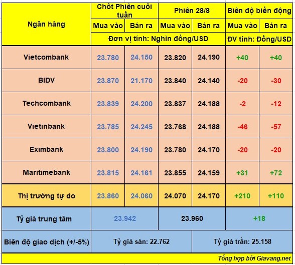 Hôm nay (28/8), Ngân hàng Nhà nước công bố tỷ giá trung tâm cặp đồng tiền VND/USD được áp dụng trong ngày ở mức 23.960 VND/USD, tăng 18 đồng so với công bố cuối tuần trước.