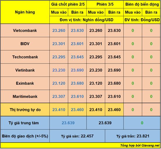 Hôm nay (3/5), Ngân hàng Nhà nước công bố tỷ giá trung tâm cặp đồng tiền VND/USD được áp dụng trong ngày ở mức 23.639 VND/USD, đi ngang so với công bố trước. Với biên độ +/-5% theo quy định, tỷ giá sàn là 22.457 VND/USD, tỷ giá trần 24.821 VND/USD.