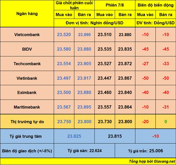 Hôm nay (7/8), Ngân hàng Nhà nước công bố tỷ giá trung tâm cặp đồng tiền VND/USD được áp dụng trong ngày ở mức 23.815 VND/USD, giảm 10 đồng so với công bố trước. Với biên độ +/-5% theo quy định, tỷ giá sàn là 22.624 VND/USD, tỷ giá trần là 25.006 VND/USD.