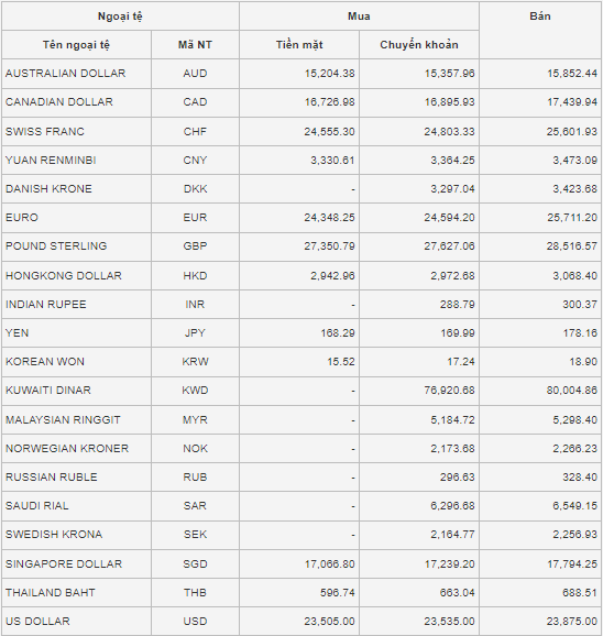 Ngân hàng Vietcombank, niêm yết giao dịch mua – bán ở mốc 23.505 – 23.875 VND/USD, giảm 5 đồng giá mua và bán so với chốt phiên thứ Tư.