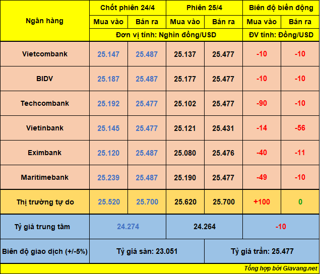 Ngân hàng Eximbank, niêm yết giao dịch mua – bán ở mốc 25.080 – 25.476 VND/USD, giảm 40 đồng giá mua, 11 đồng giá bán so với chốt phiên 24/4.