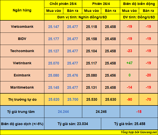 Ngân hàng Vietinbank, niêm yết giao dịch mua – bán ở mốc 25.117 – 25.458 VND/USD, mua vào tăng 41 đồng, bán ra giảm 19 đồng so với chốt phiên 25/4.