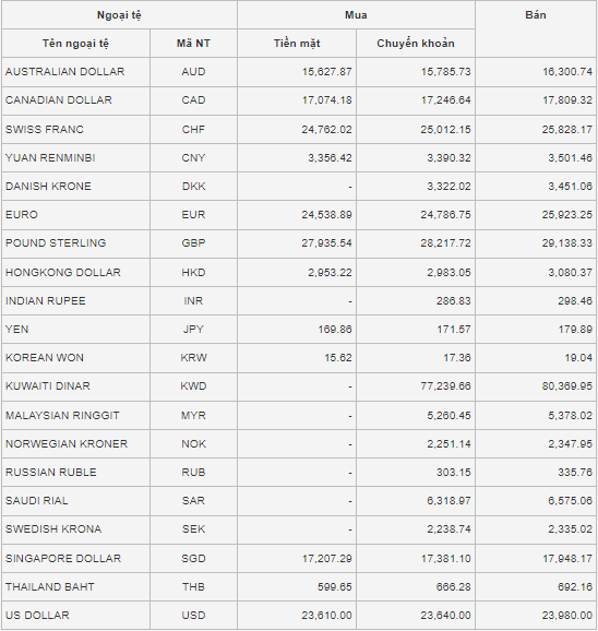 Ngân hàng Vietcombank, niêm yết giao dịch mua – bán ở mốc 23.610 – 23.980 VND/USD, giảm 10 đồng chiều mua và bán so với giá chốt phiên trước.