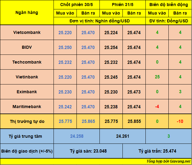 Ngân hàng Vietcombank, niêm yết giao dịch mua – bán ở mốc 25.224 – 25.474 VND/USD, tăng 4 đồng cả hai chiều mua – bán so với giá chốt phiên 30/5.