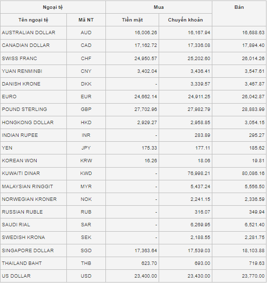 Ngân hàng Vietcombank, niêm yết giao dịch mua – bán ở mốc 23.400 – 23.770 VND/USD, giảm 20 đồng giá mua – bán so với chốt phiên thứ Ba.