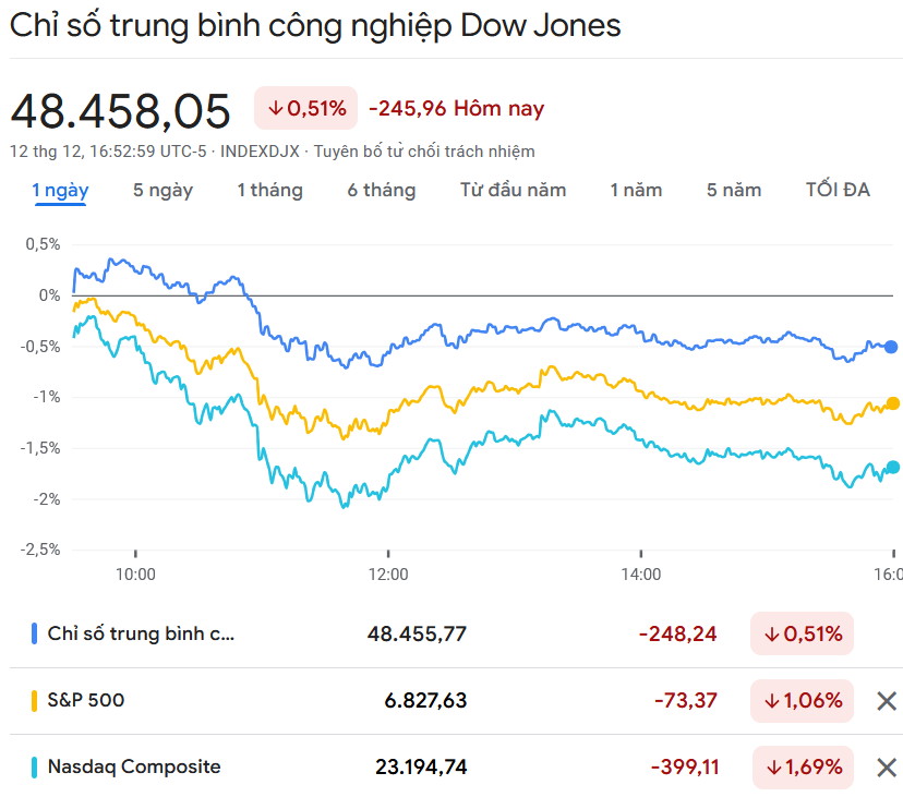 Chỉ số Dow Jones giảm 245,96 điểm (tương đương 0,51%) xuống 48.458,05 điểm, dù trước đó trong phiên đã lập mức cao kỷ lục mới.