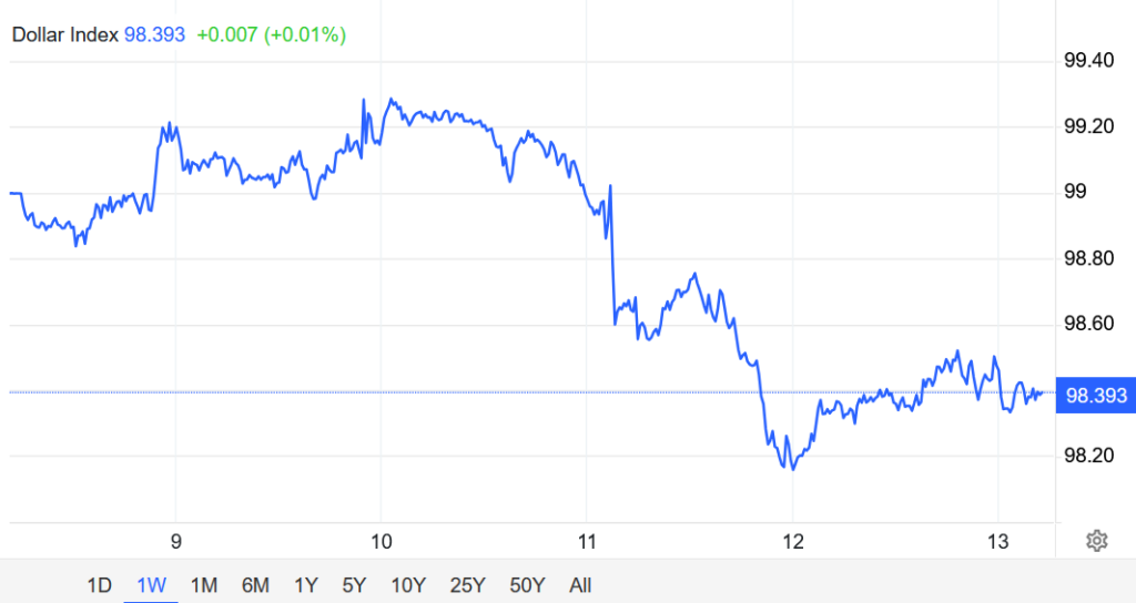 Chỉ số DXY dao động gần mức thấp nhất trong hai tháng quanh 98,3 điểm, ghi nhận tuần giảm thứ ba liên tiếp, khi nhà đầu tư tiếp nhận các bình luận từ Cục Dự trữ Liên bang Mỹ (Fed) và đánh giá lại triển vọng lãi suất năm 2026. Tuần này, Fed đã cắt giảm lãi suất 25 điểm cơ bản xuống biên độ 3,50%–3,75%, đánh dấu lần giảm thứ ba liên tiếp, đồng thời vẫn giữ kỳ vọng chỉ có thêm một lần cắt giảm nữa trong năm tới.
