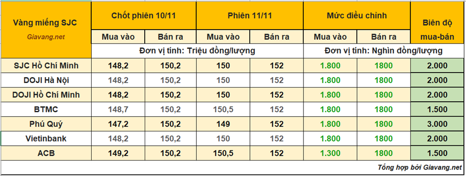DOJI Hà Nội và Hồ Chí Minh, niêm yết giao dịch mua – bán ở mức 150 – 152 triệu đồng/lượng, giá mua và giá bán cùng tăng 1,8 triệu đồng mỗi lượng so với giá chốt phiên 10/11.