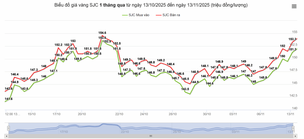 (GVNET) –  Nhịp tăng mạnh đẩy giá vàng thế giới vượt $4200 đã thúc đẩy giá vàng trong nước tăng rất mạnh trong phiên hôm nay 13/11. Sau 2 lần điều chỉnh giá, vàng miếng hiện bán ra ở mức 154 triệu đồng mỗi lượng…