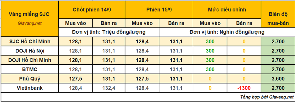 DOJI Hà Nội và Hồ Chí Minh, niêm yết giao dịch mua – bán ở mức 128,4 – 131,1 triệu đồng/lượng, giá mua tăng 300 nghìn đồng và giá bán đi ngang so với giá chốt phiên 14/9.