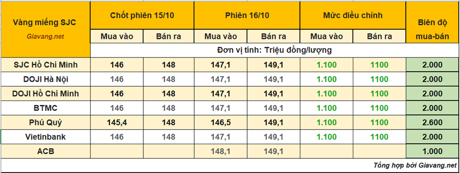 DOJI Hà Nội và Hồ Chí Minh, niêm yết giao dịch mua – bán ở mức 147,1 – 149,1 triệu đồng/lượng, giá mua tăng 1,1 triệu đồng mỗi lượng và giá bán tăng thêm 1,1 triệu đồng mỗi lượng so với giá chốt phiên 15/10.
