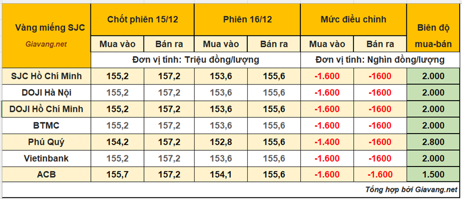 DOJI Hà Nội và Hồ Chí Minh, niêm yết giao dịch mua – bán ở mức 153,6 – 155,6 triệu đồng/lượng, giá mua và giá bán cùng giảm 1,6 triệu đồng so với giá chốt phiên 15/12.