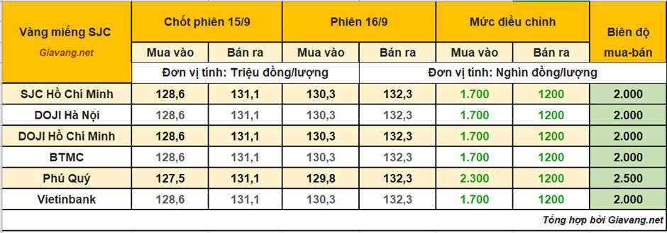 Vàng miếng tại Phú Quý định giá giao dịch tại 129,8 – 132,3 triệu đồng/lượng – giá mua tăng 2,3 triệu và giá bán tăng 1,2 triệu so với chốt phiên 15/9.