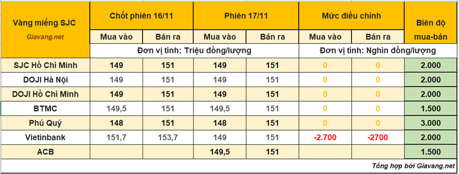 DOJI Hà Nội và Hồ Chí Minh, niêm yết giao dịch mua – bán ở mức 149 – 151 triệu đồng/lượng, giá mua và giá bán cùng đi ngang so với giá chốt phiên 16/11.