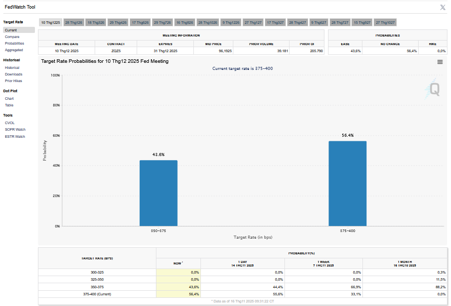 Tính tới 16/11, theo công cụ CME FedWatch, thị trường chỉ còn đánh cược 44% Fed hạ lãi suất 0,25 điểm phần trăm trong cuộc họp 10/12, thấp hơn nhiều so với tỷ lệ 65% giữa tuần trước và mức trên 90% hồi cuối tháng 10.