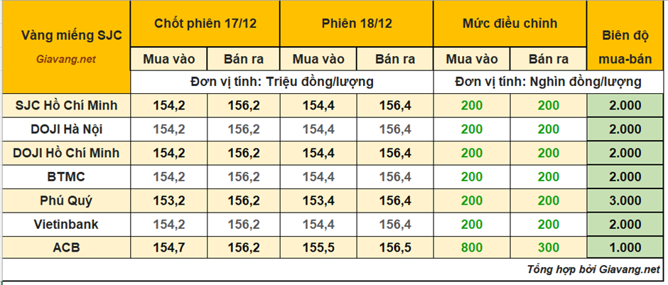 DOJI Hà Nội và Hồ Chí Minh, niêm yết giao dịch mua – bán ở mức 154,4 – 156,4 triệu đồng/lượng, giá mua và giá bán tăng thêm 200 nghìn so với giá chốt phiên 17/12.