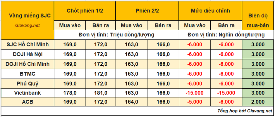 Bảo Tín Minh Châu định giá giao dịch tại 163 – 166 triệu đồng/lượng – giá mua hạ 6 triệu đồng và giá bán sụt 6 triệu so với chốt phiên ngày 1/2.