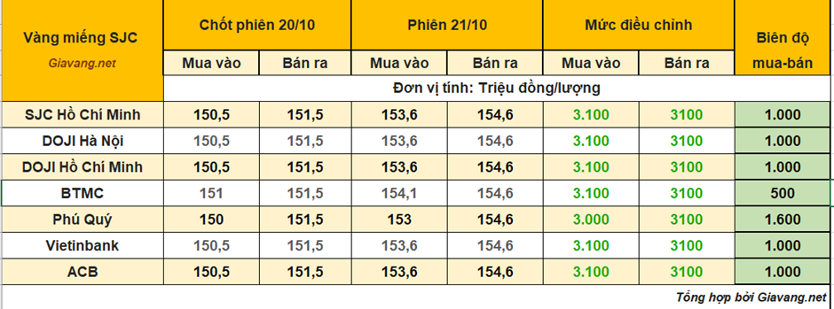DOJI Hà Nội và Hồ Chí Minh, niêm yết giao dịch mua – bán ở mức 153,6 – 154,6 triệu đồng/lượng, giá mua 3,1 triệu đồng mỗi lượng và giá bán tăng 3,1 triệu đồng so với giá chốt phiên 20/10.