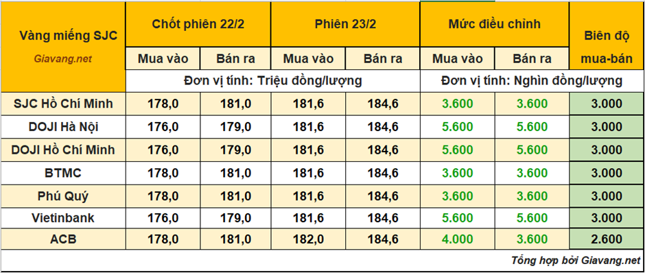 DOJI Hà Nội và Hồ Chí Minh, niêm yết giao dịch mua – bán ở mức 181,6 – 184,6 triệu đồng/lượng, giá mua cao hơn 5,6 triệu và giá bán tăng 5,6 triệu so với giá chốt phiên 22/2.
