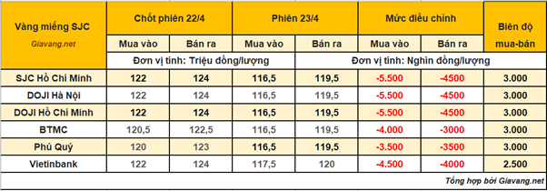 Bảo Tín Minh Châu hành động quyết ít liệt hơn, giá mua giảm 4 triệu và hạ 3 triệu chiều bán so với cuối ngày 22/4, định giá giao dịch tại 116,5 – 119,5 triệu đồng/lượng.