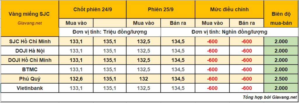 DOJI Hà Nội và Hồ Chí Minh, niêm yết giao dịch mua – bán ở mức 132,5 – 134,5 triệu đồng/lượng, giá mua và giá bán cùng hạ 600 nghìn đồng mỗi lượng so với giá chốt phiên 24/9.
