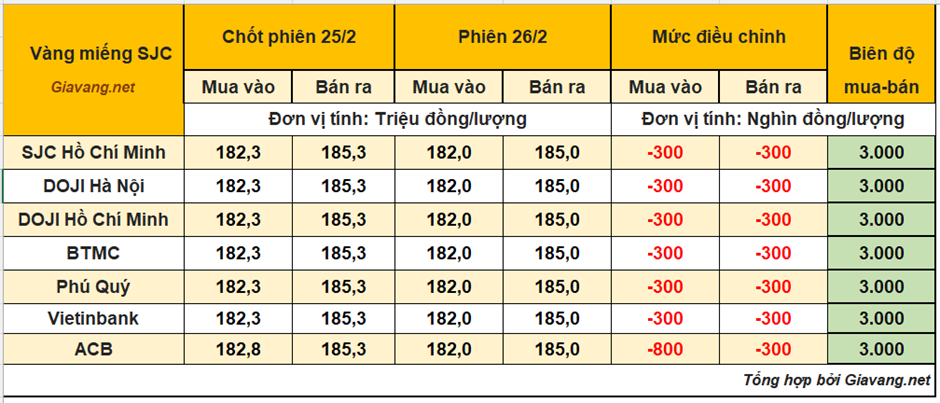 DOJI Hà Nội và Hồ Chí Minh, niêm yết giao dịch mua – bán ở mức 182 – 185 triệu đồng/lượng, giá mua hạ 300 nghìn và giá bán hạ 300 nghìn so với giá chốt phiên 25/2.