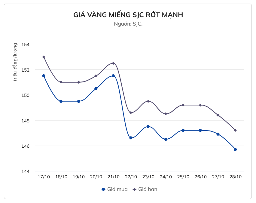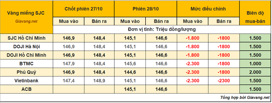 DOJI Hà Nội và Hồ Chí Minh, niêm yết giao dịch mua – bán ở mức 145,1 – 146,6 triệu đồng/lượng, giá mua hạ 1,8 triệu đồng mỗi lượng và giá bán hạ 1,8 triệu đồng so với giá chốt phiên 27/10.