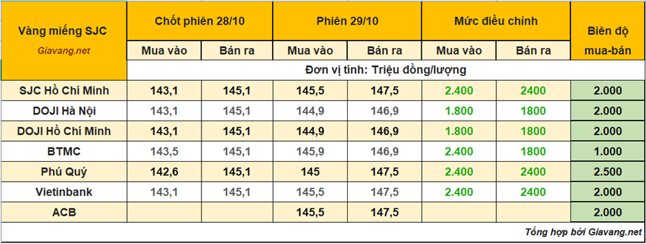Cập nhật thời điểm 14h26 ngày 29/10, vàng miếng SJC Hồ Chí Minh niêm yết giao dịch mua – bán ở mức 145,5 – 147,5 triệu đồng/lượng, giá mua tăng 2,4 triệu đồng mỗi lượng và giá bán tăng 2,4 triệu đồng mỗi lượng so với cuối ngày hôm qua.