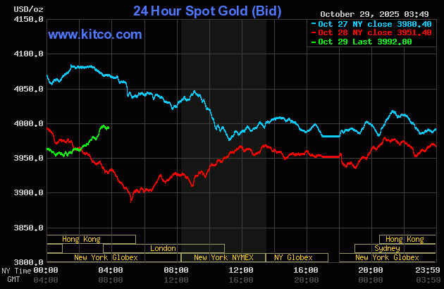(GVNET) – Trong phiên giao dịch thứ Tư ngày 29/10, giá vàng miếng trong nước đồng loạt tăng trở lại sau phiên giảm sâu… Giá vàng quốc tế đang trở lại, tiệm cận mức tâm lí $4000/oz…