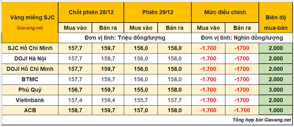 DOJI Hà Nội và Hồ Chí Minh, niêm yết giao dịch mua – bán ở mức 156 – 158 triệu đồng/lượng, giá mua và giá bán cùng lùi 1,7 triệu đồng mỗi lượng so với giá chốt phiên 28/12.