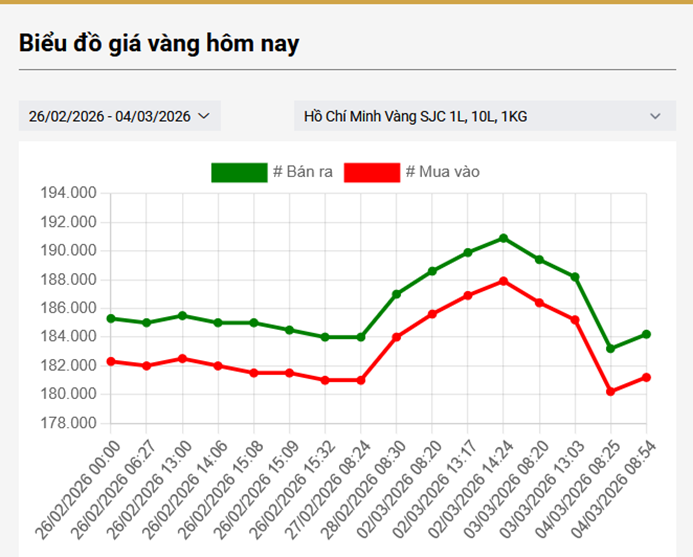 DOJI Hà Nội và Hồ Chí Minh, niêm yết giao dịch mua – bán ở mức 181,2 – 184,2 triệu đồng/lượng, giá mua giảm 4 triệu và giá bán giảm 4 triệu so với giá chốt phiên 3/3.
