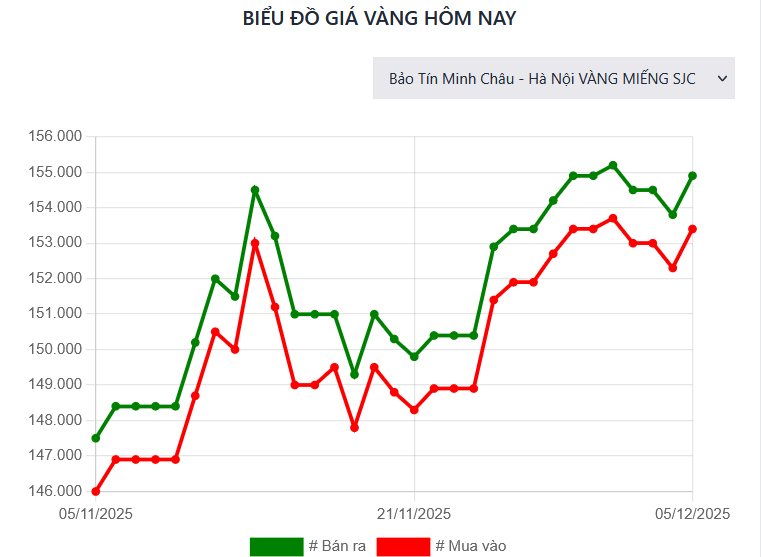 Bảo Tín Minh Châu định giá giao dịch tại 153,4 – 154,9 triệu đồng/lượng – giá mua và giá bán tăng thêm 1,1 triệu mỗi lượng với chốt phiên ngày 4/12.