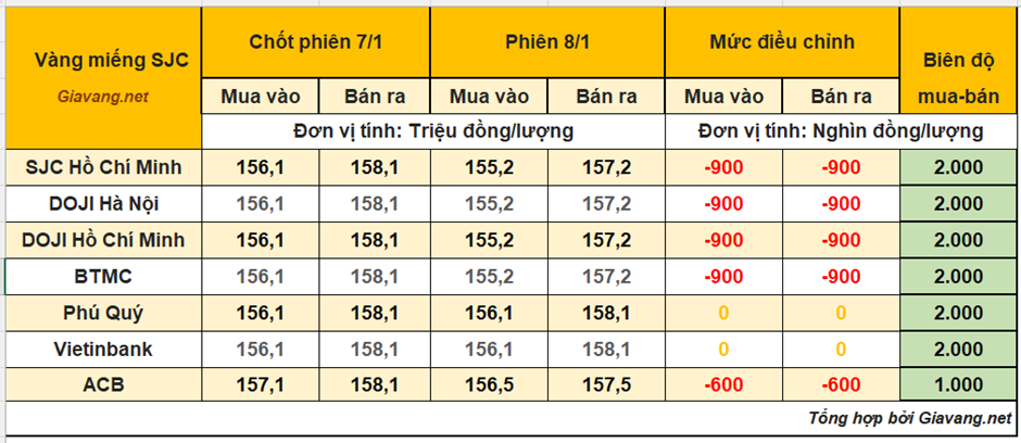 DOJI Hà Nội và Hồ Chí Minh, niêm yết giao dịch mua – bán ở mức 155,2 – 157,2 triệu đồng/lượng, giá mua và giá bán cùng hạ 900 nghìn đồng mỗi lượng so với giá chốt phiên 7/1.
