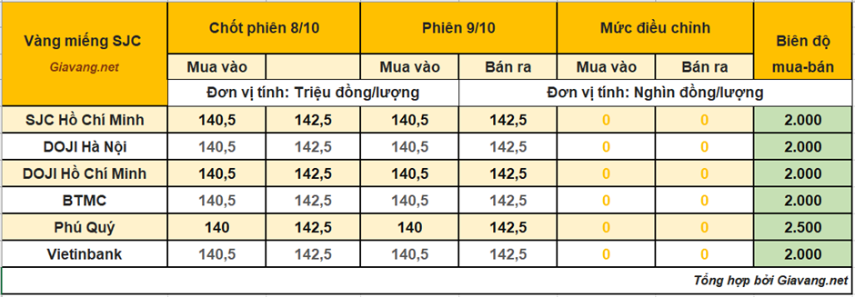 DOJI Hà Nội và Hồ Chí Minh, niêm yết giao dịch mua – bán ở mức 140,5 – 142,5 triệu đồng/lượng, giá mua và giá bán đi ngang so với giá chốt phiên 8/10.