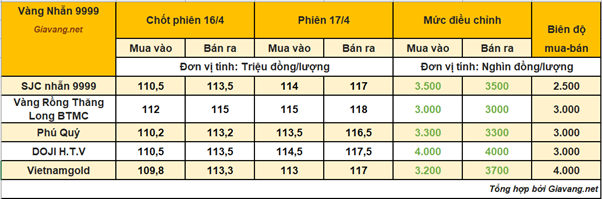 Nhẫn Phú Quý, niêm yết giao dịch mua – bán ở mức 113,5 – 116,5 triệu đồng/lượng, giá mua tăng 3,3 triệu đồng, giá bán tăng 3,3 triệu đồng/lượng so với chốt phiên 16/04.