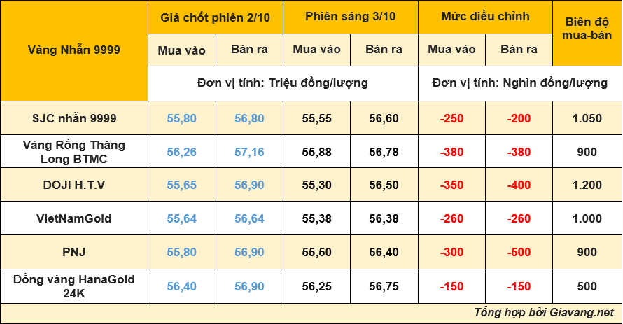 Cụ thể, lúc 11h30, ngày 3/10, nhẫn SJC 9999 niêm yết giao dịch mua – bán tại mốc 55,55 – 56,60 triệu đồng/lượng, giảm 250.000 đồng/lượng giá mua và 200.000 đồng/lượng giá bán so với chốt phiên đầu tuần.