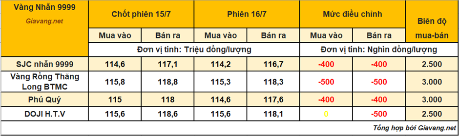 Nhẫn Bảo Tín Minh Châu, niêm yết giao dịch mua – bán ở mức 115,3 – 118,3 triệu đồng/lượng, giá mua và bán cùng hạ 500 nghìn so với cuối ngày 15/7.