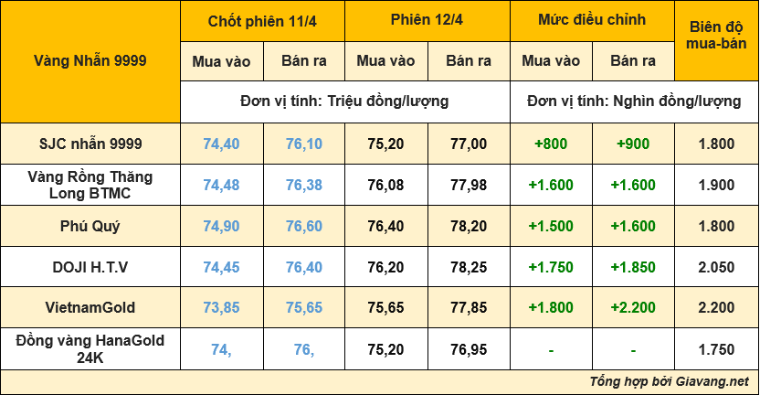 Cập nhật lúc 12h, ngày 12/4, nhẫn SJC 9999 niêm yết giao dịch mua – bán tại 75,20 – 77,00 triệu đồng/lượng, tăng 800.000 đồng/lượng chiều mua, 900.000 đồng/lượng chiều bán so với đóng cửa phiên 11/4.