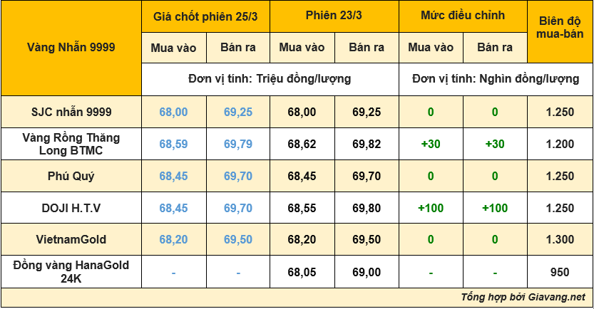 Cập nhật lúc 11h30, ngày 26/3, nhẫn SJC 9999 niêm yết giao dịch mua – bán tại 68,00 – 69,25 triệu đồng/lượng, đi ngang cả hai chiều mua – bán so với giá chốt phiên thứ Hai.