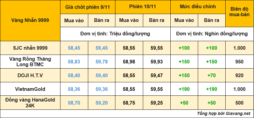Cập nhật lúc 10h30 ngày 10/11, nhẫn SJC 9999 niêm yết giao dịch mua – bán tại mốc 58,55 – 59,55 triệu đồng/lượng, tăng 100.000 đồng/lượng mua vào – bán ra so với giá chốt chiều qua.