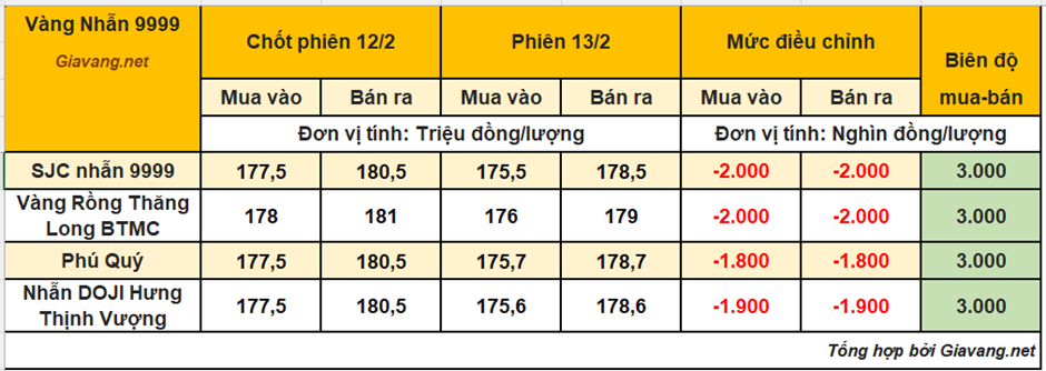 Trong khi đó, Nhẫn Phú Quý niêm yết giao dịch mua – bán ở mức 175,7 – 178,7 triệu đồng/lượng, giá mua và giá bán cùng giảm 1,8 triệu so với ngày 12/2.