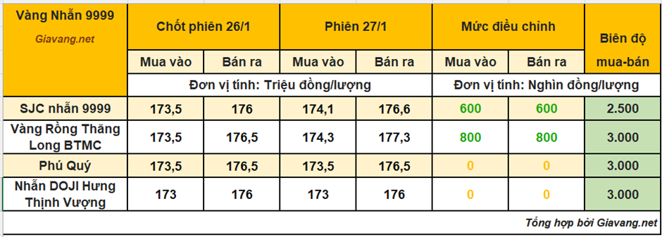 Trong khi đó, Nhẫn Phú Quý niêm yết giao dịch mua – bán ở mức 173,5 – 176,5 triệu đồng/lượng, giá mua và giá bán đi ngang so với ngày 26/1.