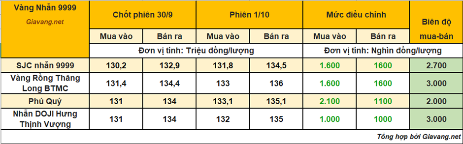 Trong khi đó, Nhẫn Phú Quý niêm yết giao dịch mua – bán ở mức 133,1 – 135,1 triệu đồng/lượng, giá mua tăng 2,1 triệu đồng và giá bán tăng thêm 1,1 triệu mỗi lượng so với ngày 30/9.