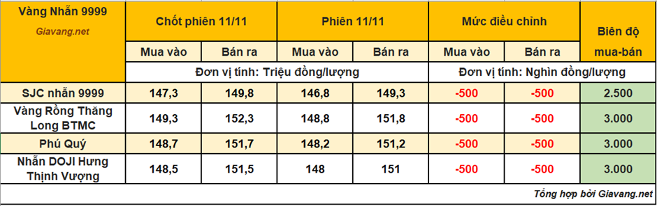 Trong khi đó, Nhẫn Phú Quý niêm yết giao dịch mua – bán ở mức 148,2 – 151,2 triệu đồng/lượng, giá mua và giá bán cùng hạ nửa triệu đồng mỗi lượng so với ngày 11/11.
